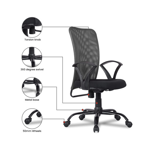 - TECH SPECIFICATIONS: Armrest: Fibre material | Swivel: 360º swivel | Wheels: 50mm wheels | Base: Metal | Maximum weight capacity: 130 kgs | Height Suitability: 5ft - 5ft.10" | Color: Smart Black
